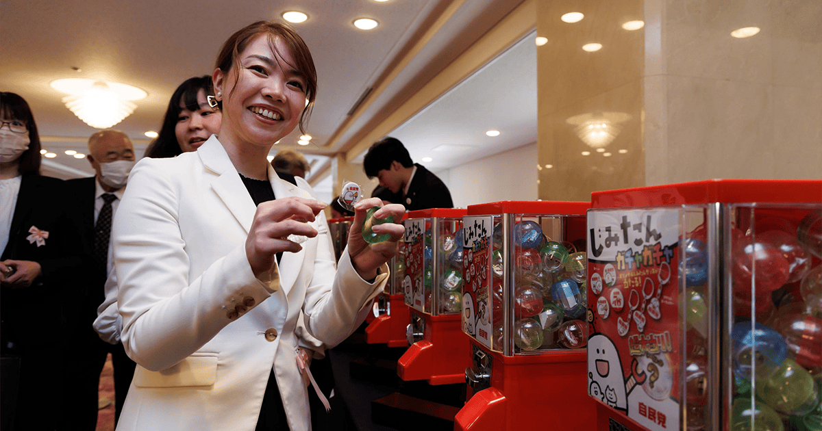 カプセルに高市総裁のグッズや「じみたん」バッジ等が入ったカプセルトイを楽しむ参加者