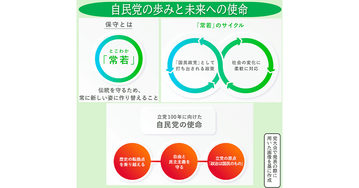 わが党の政治家は実に多様な人材が集まって、過度に党や特定の主義主張に依存することなく、自らの支持基盤をつくり上げてきました。自立した個人が結束して、国民の期待に応える政策を打ち出し、支持を得てきました。自由、民主主義、保守という考え方を土台に、現実主義、合意形成、地域密着という基本姿勢を貫き、時代に即した政策を国民政党として打ち出してきたのです。そのサイクルを「常若」と表現しました。