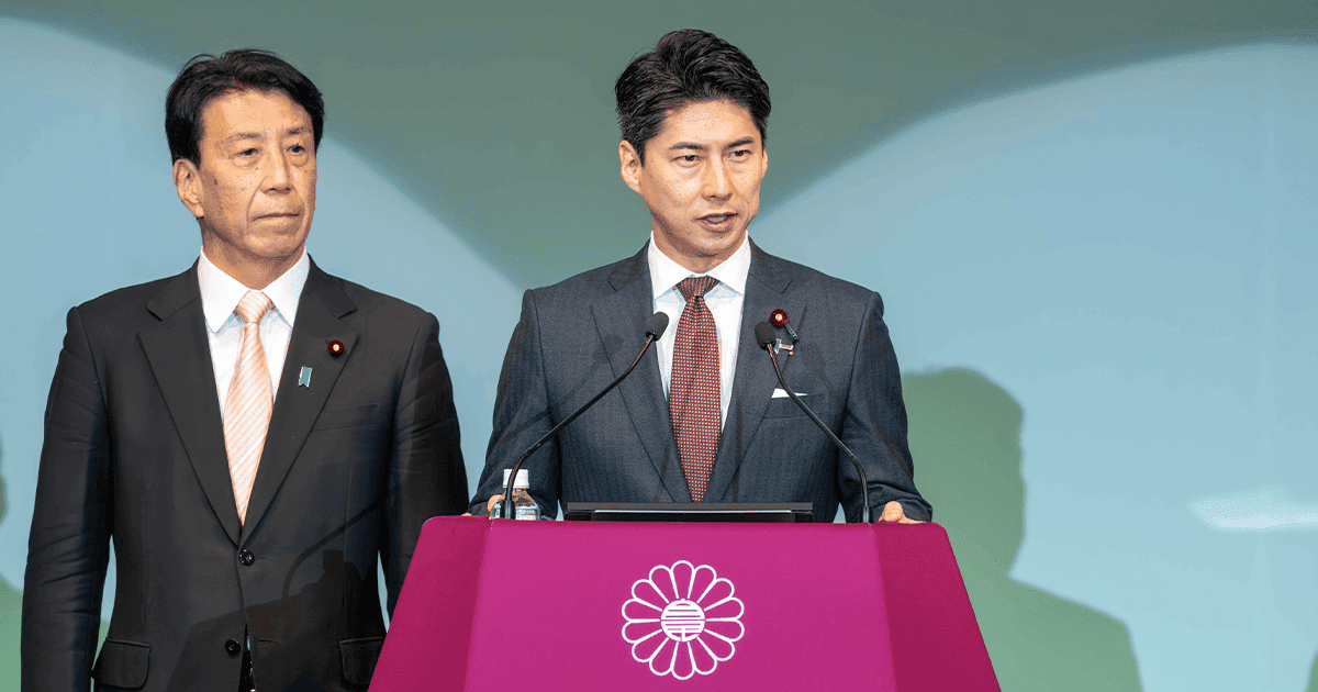 党大会で立党70年ビジョンを発表する中曽根康隆・新ビジョン起草委員長と齋藤座長(左)
