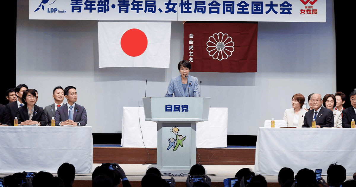 青年部・青年局、女性局合同全国大会であいさつをする高市早苗総裁