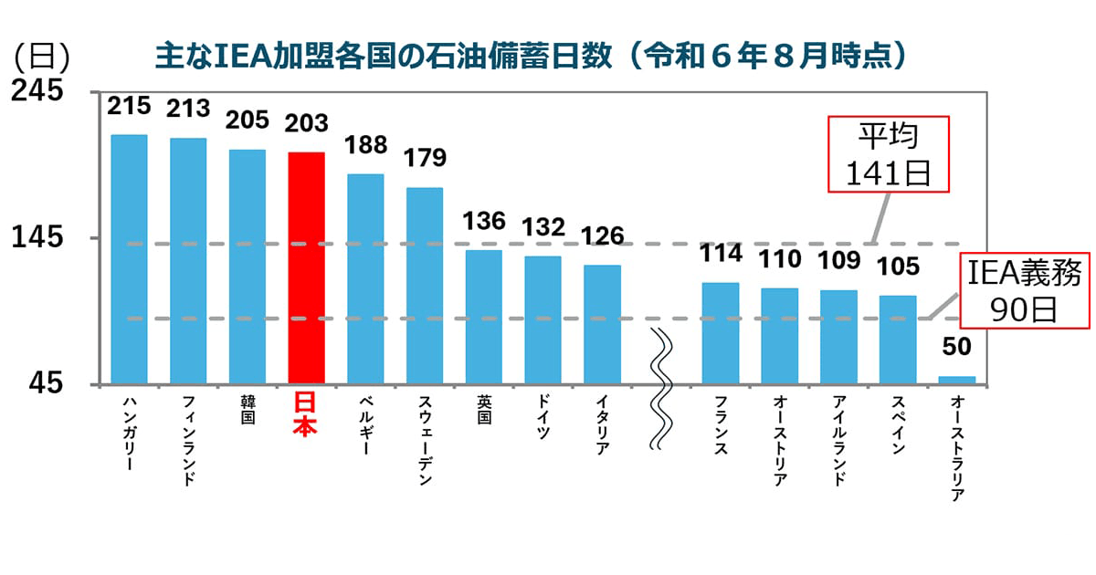 さらに平成20年代からは第三の備蓄として、サウジアラビアやクウェートといった産油国と連携した「産油国共同備蓄」を始動。現在、わが国では国内消費量の約8カ月分を確保しています。これは国際エネルギー機関(IEA)が求める90日分やIEA加盟各国の備蓄平均141日分を大きく上回り、主要IEA加盟国の中でも最上位クラスの備蓄量です(グラフ)。