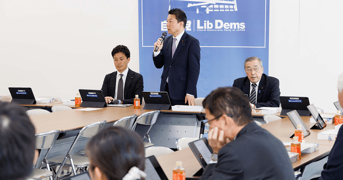 防衛産業強化に向けた取り組みを強調する本田太郎党国防部会長(中央)