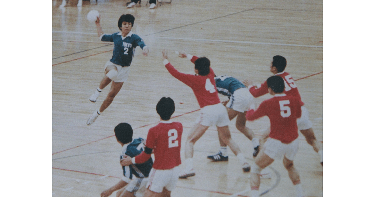 この写真は、東京大学ハンドボール部時代の試合でシュートを放つ瞬間の一枚です。高校から続けていた競技で、大学に入ったら必ず続けたいと思い、入学式の翌日に入部しました。当時の部は決して強豪ではありませんでしたが、個性豊かな先輩や仲間に恵まれました。試合に勝つと「飲ませてやる」と先輩に連れて行かれたものの、なぜか食べ物は出てこない。空腹の同期と他のテーブルに芸を披露してつまみを分けてもらったこともあります。そんな仲間との時間が、今も大切な思い出です。