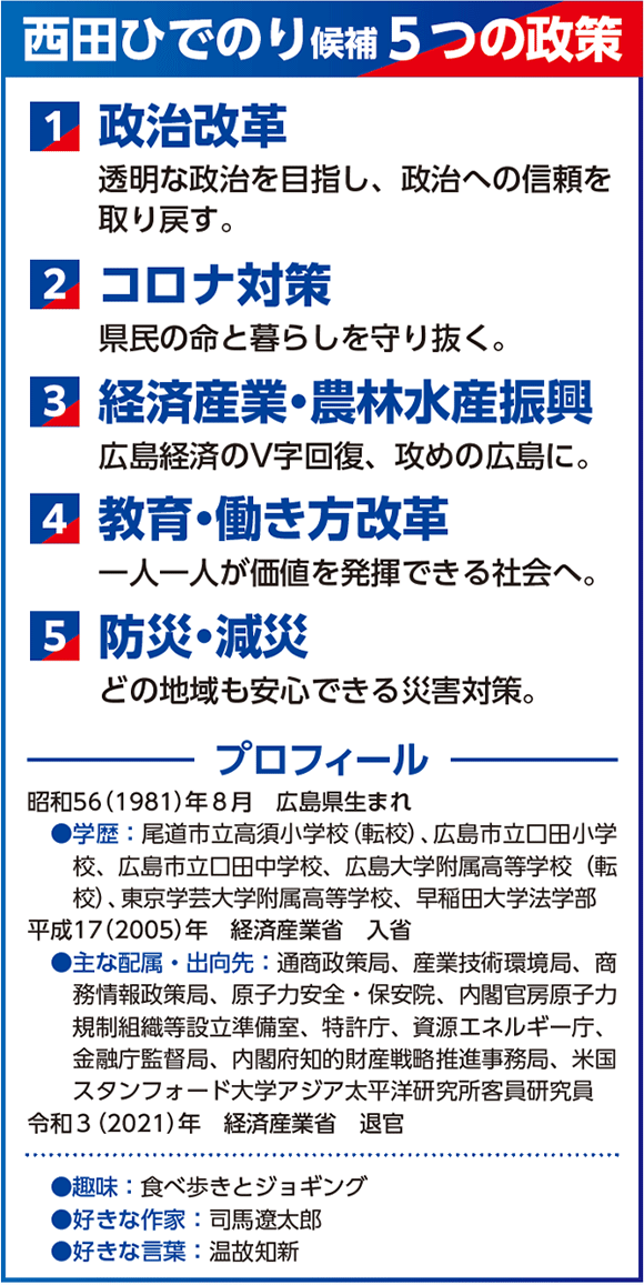 西田候補は、政治改革、コロナ対策をはじめとして「5つの政策」を掲げている。経済振興では、カーボンニュートラルや環境、デジタル化といった世界的な潮流も見据えながら広島経済のイノベーションに挑む。また、農林水産業の支援、教育や防災といった県民の暮らしに直結する分野にも目配りを欠かさない。