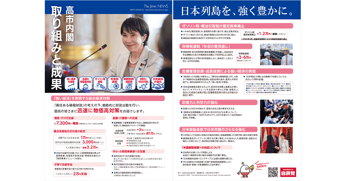 迅速な物価高対応、ガソリン税の暫定税率廃止や所得税減税、危機管理投資・成長投資による「強い経済」の実現、さらに防衛力と外交力の強化、日米同盟の深化まで。