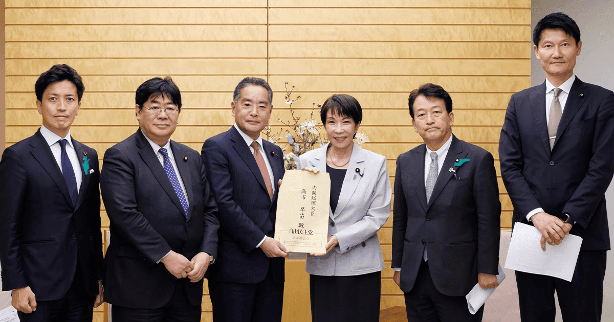 高市早苗総理(中央右)に提言を申し入れる井上信治党環境・温暖化対策調査会長(中央左)、