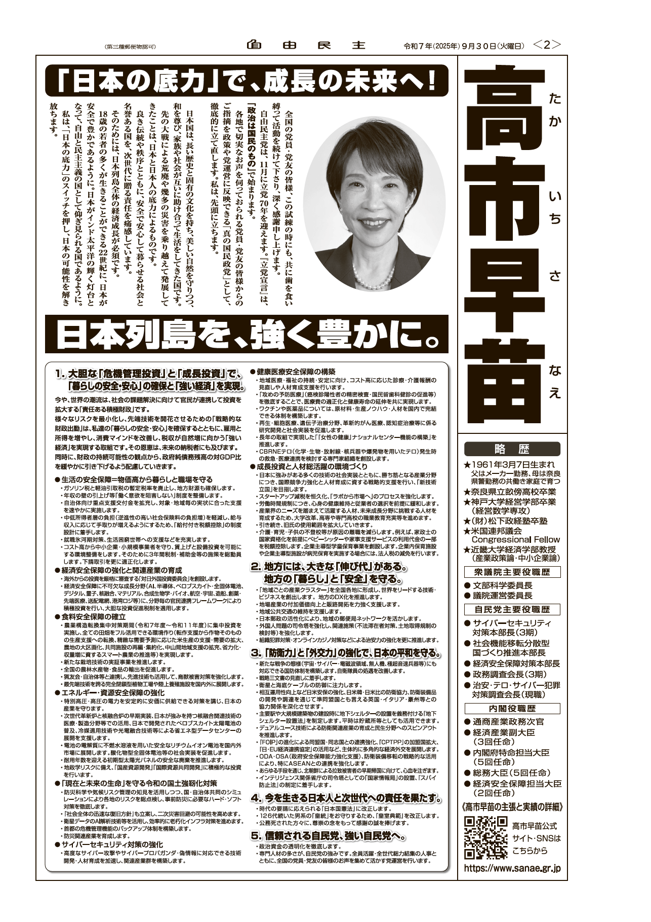 しかし、強さだけの人ではありません。きめ細かい配慮と優しさを備えた、そして何よりチャーミングな人です。そんな高市早苗さんをぜひ、日本初の女性総理に押し上げてください。