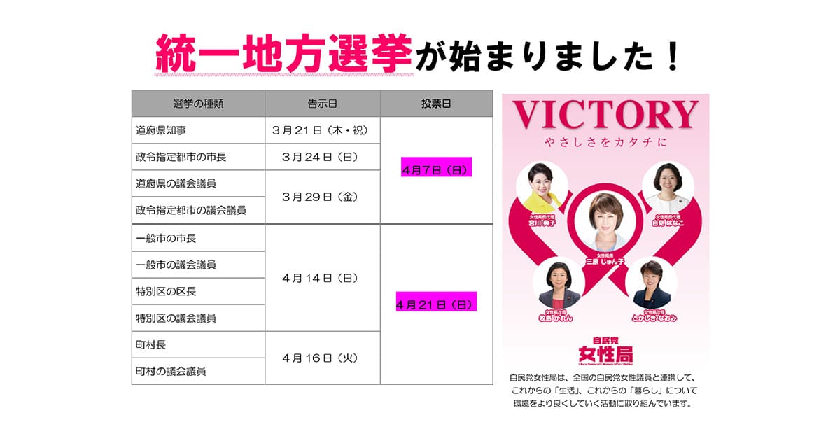 ホーム 女性局ニュース 統一地方選挙スタート 女性局ニュース 統一地方選挙スタート 2019.03.29 ポスト シェア LINEで送る こんにちは。自民党女性局です。 いよいよ平成最後となる統一地方選挙が始まりました。みなさまが暮らす地域の未来を託すことができるリーダーを決める、大事な選挙です。 ぜひ、みなさまのお住まいの地域の自民党女性候補者に力強いご支援をお願いします。 統一地方選挙 自民党公認・推薦候補者情報、政策パンフレットはこちら(自民党HP) 前の記事へ 次の記事へ ページトップへ