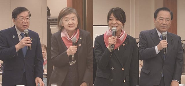 (平口洋県連会長、前原園江県連女性局次長、灰岡香奈県連女性局長、富永健三県連幹事長)