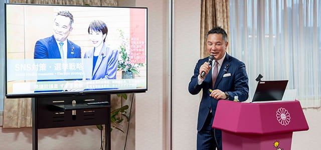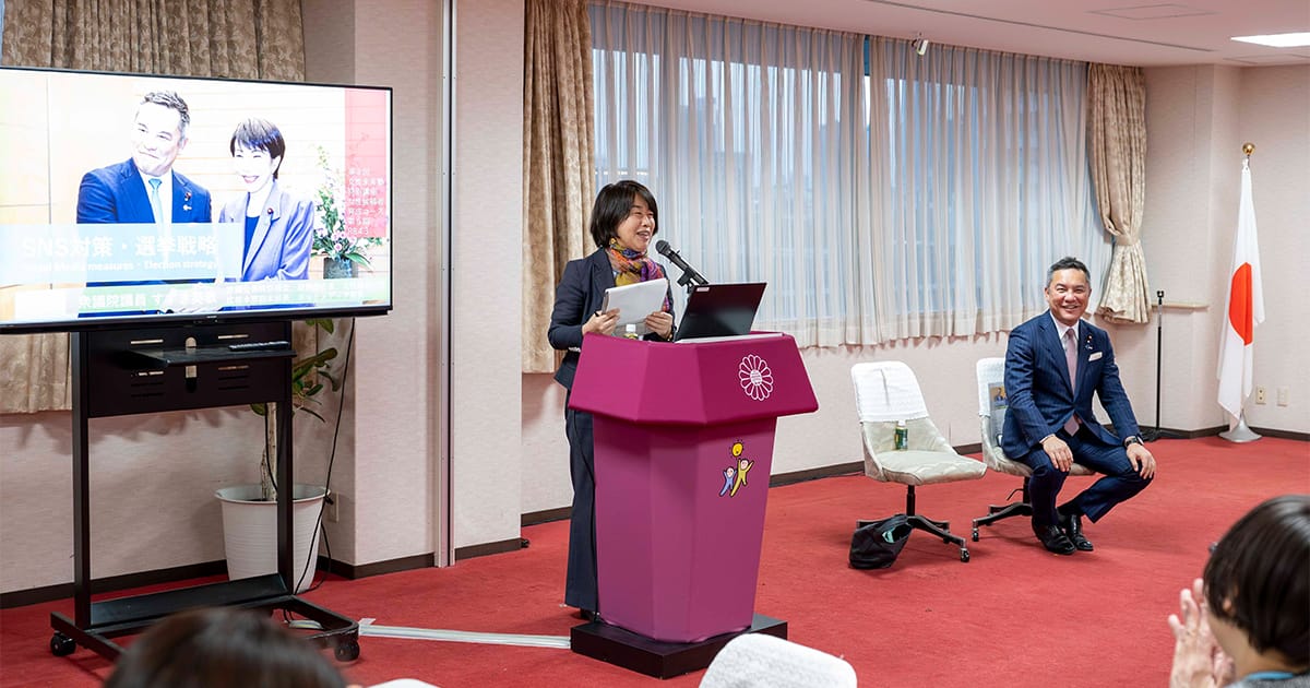 司会は加藤明良女性局研修部長が務めました。今回は「選挙戦略・SNS対策」をテーマに、先の衆院選・参院選を踏まえたSNS分析についてや発信の仕方についてネットメディア局長でもある鈴木英敬女性局長代理が講演しました。