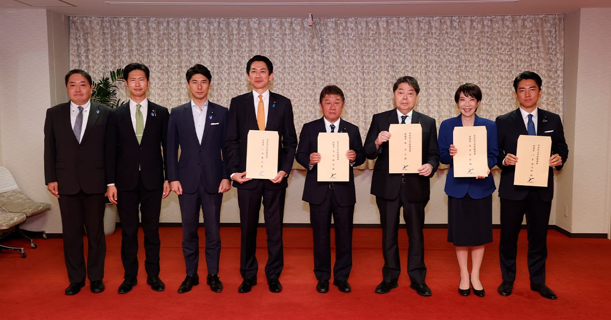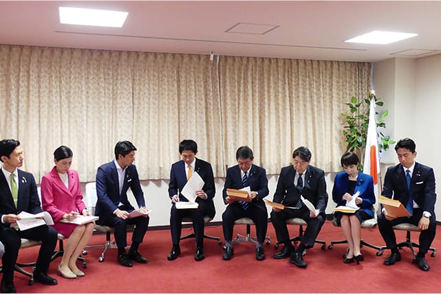 中曽根康隆青年局長と神谷政幸青年局長代理、須田旭中央常任委員会議長は、演説会直後の総裁候補者に、青年部・青年局・学生部としての声明文を手交しました。