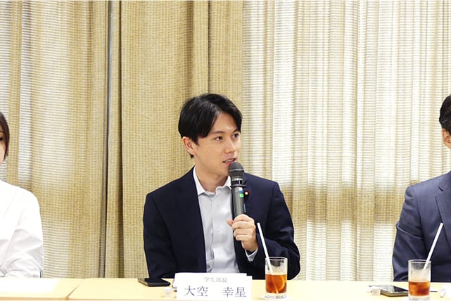 また、大空学生部長は学生との意見交換の中で「本日の参加者に最も年齢が近い国会議員として、学生の皆さんの声を政策に反映できるよう努めたい」と学生の意見を受け止めました。