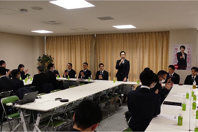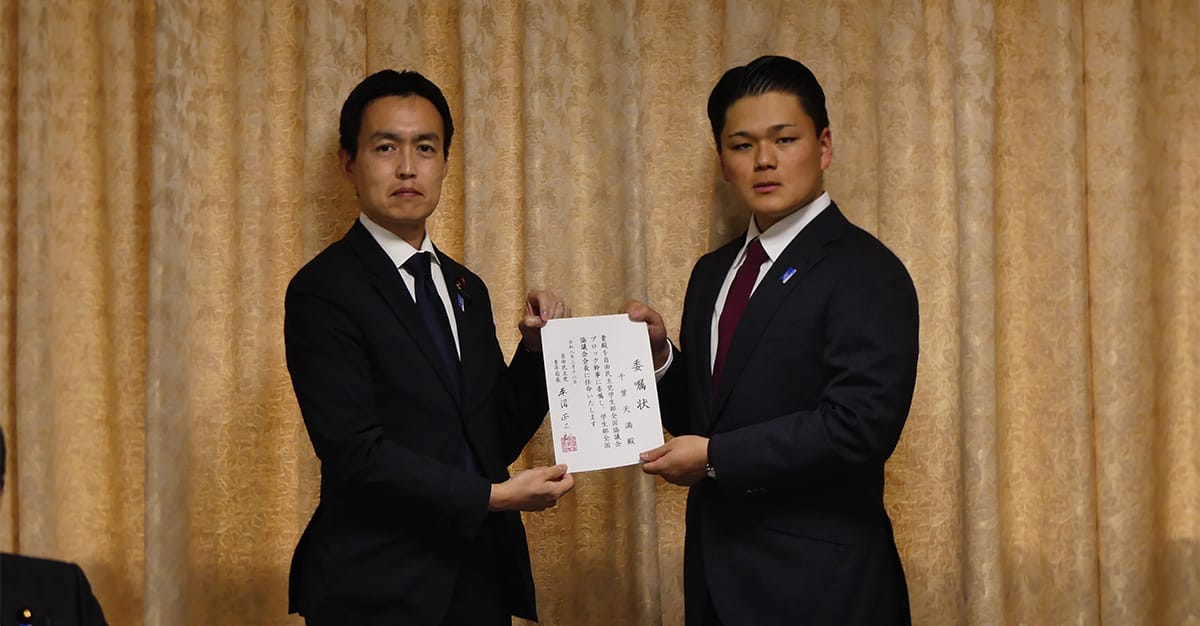 平沼正二郎青年局長の指名により、令和8年度の学生部全国協議会会長に就任した北海道連学生部の千葉天満次期学生部長は「学生部の連携をより一層強化できるように努めたい」と意欲を示し、平沼青年局長は「全国各地で根を張って活動を続けている学生部員の活動が充実するよう支援したい」と訴えました。