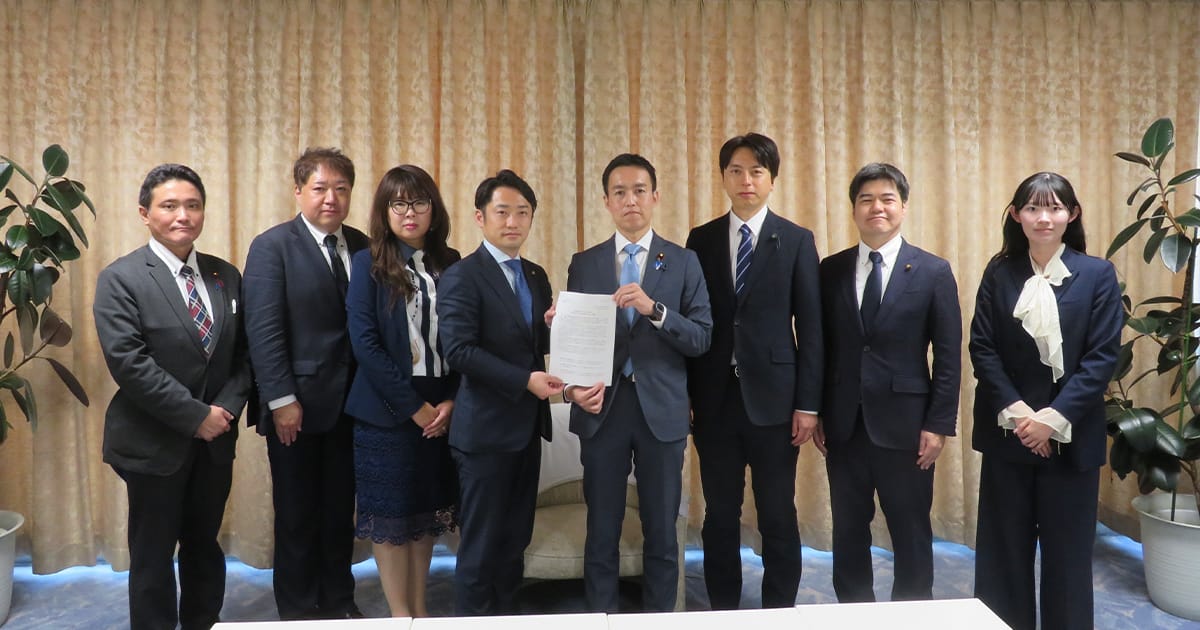平沼正二郎青年局長は、大阪府連青年局(水原慶明青年局長)から「副首都機能の整備に係る立法措置及び特別区設置に係る住民投票制度に関する要望書」を受け取りました。